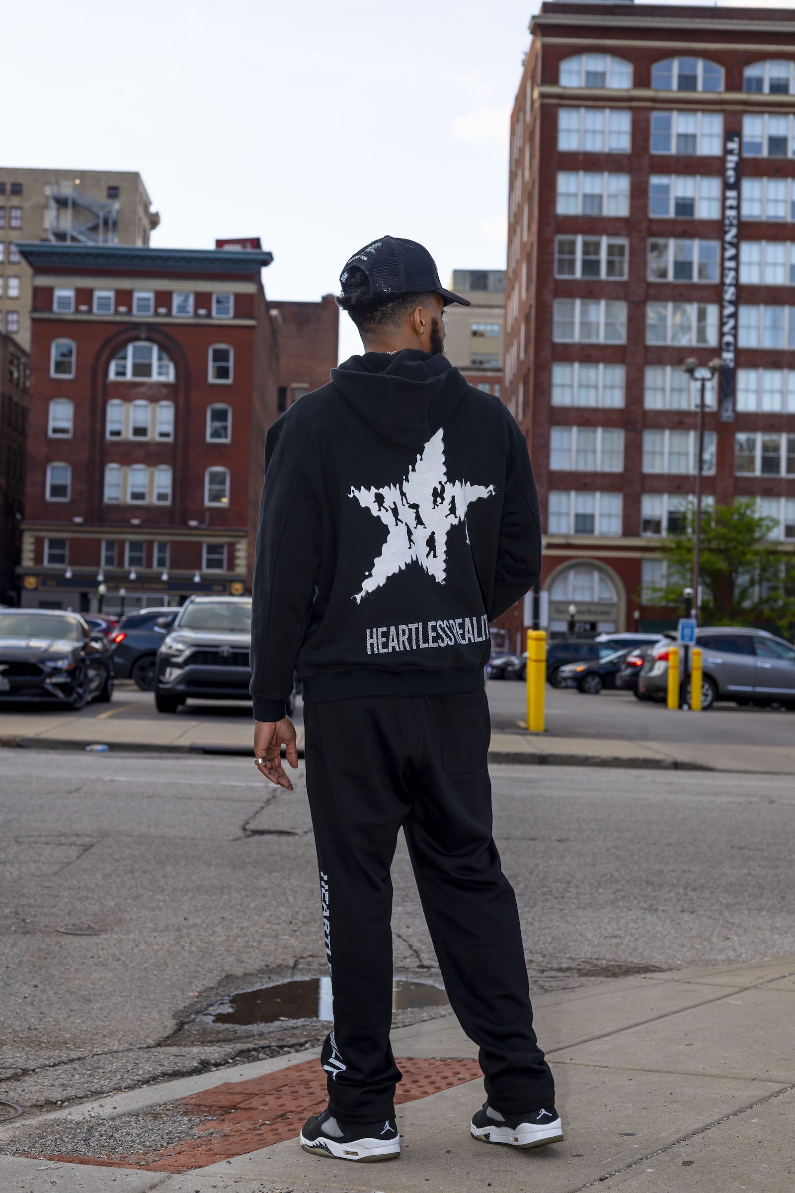 The “Infinite Link” hoodie is for the ones who believe their time is coming. With Heartless Reality spelled in stardust across the chest and a lone figure walking into a star on the back, this hoodie is about chasing the infinite — one star at a time.